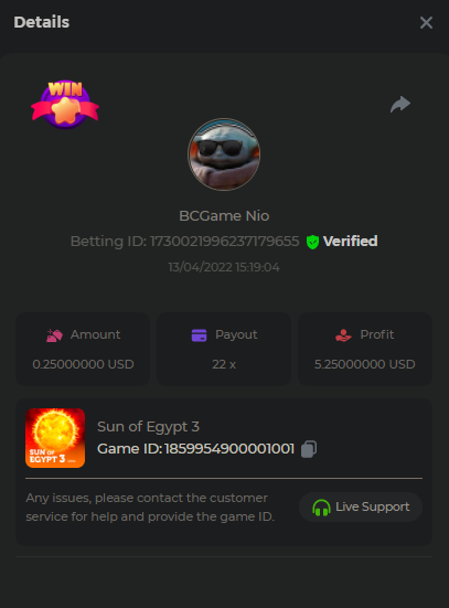 Welcome back to another Booongo event. As you probably know, sometimes the journey of a thousand miles begins with a single step. Here, you can start your journey with a prize pool of up to $4,000! Your first stop may be Egypt because we've selected the following four slots: Sun of Egypt 3, Happy Fish, Queen of the sun, and Candy Boom. Just bet! Life is short, make it sweet. Eligible Games Win the highest multiplier on the Booongo games listed below Sun of Egypt 3 Happy Fish Queen of the Sun Candy boom The highest multiplier reached in each game will be added together and counted as total points. Bonus buys are allowed. If the player submits multiple winning entries for the same game, the entry with the highest multiplier will be valid. Minimum VIP Tier Must be VIP04 or higher in order to enter this event. Minimum Payout Minimum payout to qualify is 10x (in any game) for a valid entry. Minimum Bet Size Sun of Egypt 3 - $0.25 Happy Fish - $0.20 Queen of the Sun - $0.25 Candy boom - $0.20 Eligible Coins All cryptocurrencies are eligible (excepting JB, and BCL). Free Play Mode is not valid for this event. Prize Pool & Reward Breakdown The winners will win a share of the prize pool based on the detailed ranking below. Anyone who completes the side bounty will receive a share of a 10% of the prize pool. BOUNTY - Post a bet that shows exactly 76x payout on any of the 4 slots within the timeframe of this battle and receive an equal share of 10% of the prize pool! If nobody gets exactly 76x the person/s closest to 76x will win this bounty! Original rules apply with min bet, minimum payout How to Enter Access the game to select your Bet ID, click on the Share icon (↷) and then Copy link. Return to the topic, paste the link in the field "Reply to this topic..." E.g.: https://bc.game/sd/?sd=10IE0XQSEULAMR In the same post, upload a screenshot of your win by clicking the game ID WITH VIEW IN USD mode ENABLED (accessible at the bottom of dropdown menu for your wallet up top, and Submit Reply. Done! This way, we can ensure that your bet indeed met the minimum requirement at the time of placing it: Example post - Link: https://bc.game/sd/?sd=10IE0XQSEULAMR Good luck everyone!