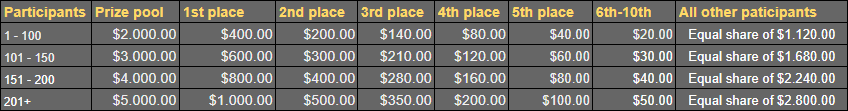 Congratulations to our winners! The prizes of the selected players were sent by Inbox, and seven players completed the extra bounty (See more details below). Top 93 Participants Ranking Username Prize Extra bonus 1st Erifyli $500 YES 2nd Sleepiez $250 YES 3rd Beautiful_day $150 YES 4th LemmeWin $100 - 5th NoWins $50 - 6th Cryptoliser $50 YES 7th prats12345 $50 - 8th Nymphetamine $50 - 9th Bnuggz420 $50 - 10th Mvownz $50 - 11th Hoya_ $5.37 - 12th KG562 $5.37 - 13th Sitah2da $5.37 - 14th Mugen $5.37 - 15th WooWPoT $5.37 - 16th W0NGA $5.37 - 17th Yhum $5.37 - 18th bestbtcfaucets $5.37 - 19th justjace $5.37 - 20th Slasher041 $5.37 - 21st Juan28 $5.37 - 22nd bigGirls_dontCry $5.37 - 23rd CivicMe $5.37 - 24th Nashka $5.37 - 25th lisachippies $5.37 - 26th Wiro212sableng $5.37 YES 27th _r_0_w3_n_4_ $5.37 - 28th Zknydljrfub $5.37 - 29th DaMiEnNn $5.37 - 30th xacutarafwb $5.37 - 31st thiago18 $5.37 - 32nd yllaeR $5.37 - 33rd AngeL211 $5.37 - 34th winsk3y $5.37 - 35th MaksatMe $5.37 - 36th nica19 $5.37 - 37th Defenath $5.37 - 38th BLessingGirL05 $5.37 - 39th Satoshimaker $5.37 - 40th sanjahimik $5.37 - 41st Elpresidente $5.37 - 42nd jadog253 $5.37 - 43rd Cryptoprem $5.37 - 44th nicehit $5.37 - 45th LemaK $5.37 - 46th CM444 $5.37 - 47th BCGAMES2 $5.37 - 48th narcisyo $5.37 YES 49th kovalev $5.37 YES 50th Knuckhead1971 $5.37 - 51st Mkulet $5.37 - 52nd Mun $5.37 - 53rd selena42 $5.37 - 54th Jannine $5.37 - 55th TonyStonks $5.37 - 56th BC-KUMTUN $5.37 - 57th MARY.BC.GAME $5.37 - 58th SugarAngel $5.37 - 59th abolfazl75 $5.37 - 60th Huypolyme $5.37 - 61st Djaki $5.37 - 62nd QUANTUM-PHYSICS $5.37 - 63rd GEKDDY $5.37 - 64th RORY $5.37 - 65th B0unty $5.37 - 66th GKD69 $5.37 - 67th badz $5.37 - 68th rasmus1234 $5.37 - 69th Enuelkno $5.37 - 70th Azader $5.37 - 71st RORONOAZORRO777 $5.37 - 72nd bassabar $5.37 - 73rd amyra $5.37 - 74th Unlock99 $5.37 - 75th Rodemmale $5.37 - 76th Dragonrose $5.37 - 77th jhonncueva $5.37 - 78th Unlim $5.37 - 79th Kristalina $5.37 - 80th Wine $5.37 - 81st Player987 $5.37 - 82nd Spritz $5.37 - 83rd Lovel11 $5.37 - 84th v1rtu0s $5.37 - 85th Betmin $5.37 - 86th Almaryoww $5.37 - 87th DineroBit $5.37 - 88th Bigdaddykana $5.37 - 89th -Axie- $5.37 - 90th nsrao123 $5.37 - 91st alwaysgood $5.37 - 92nd SURYA_PTC $5.37 - 93rd winit $5.37 - Check out our official promos & events page here.