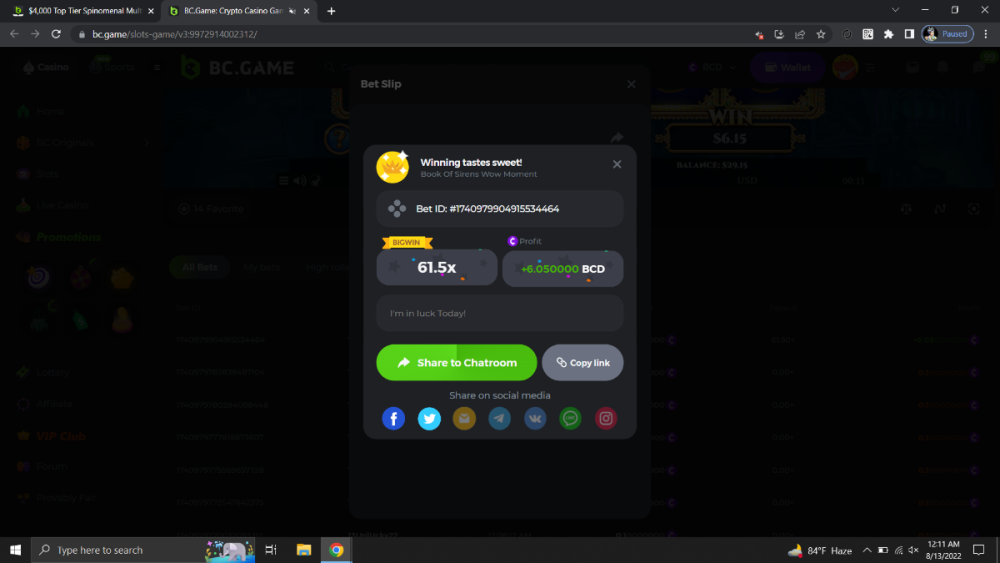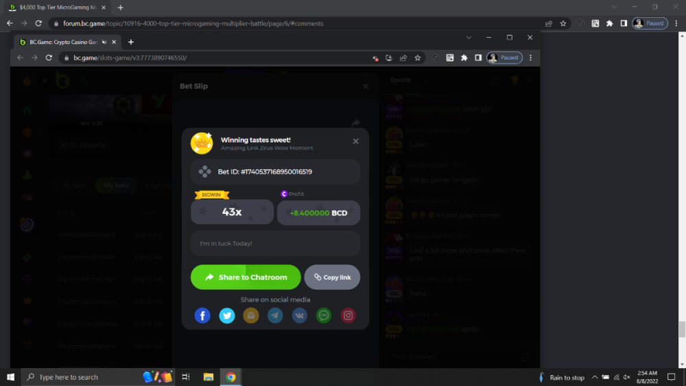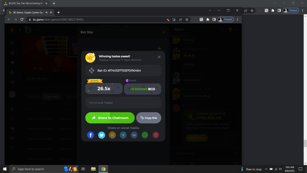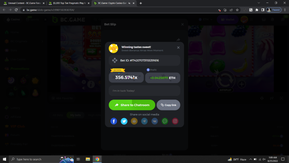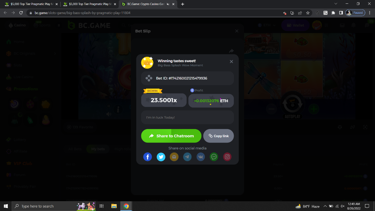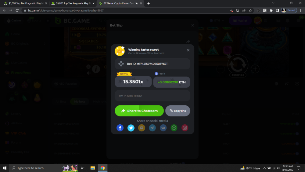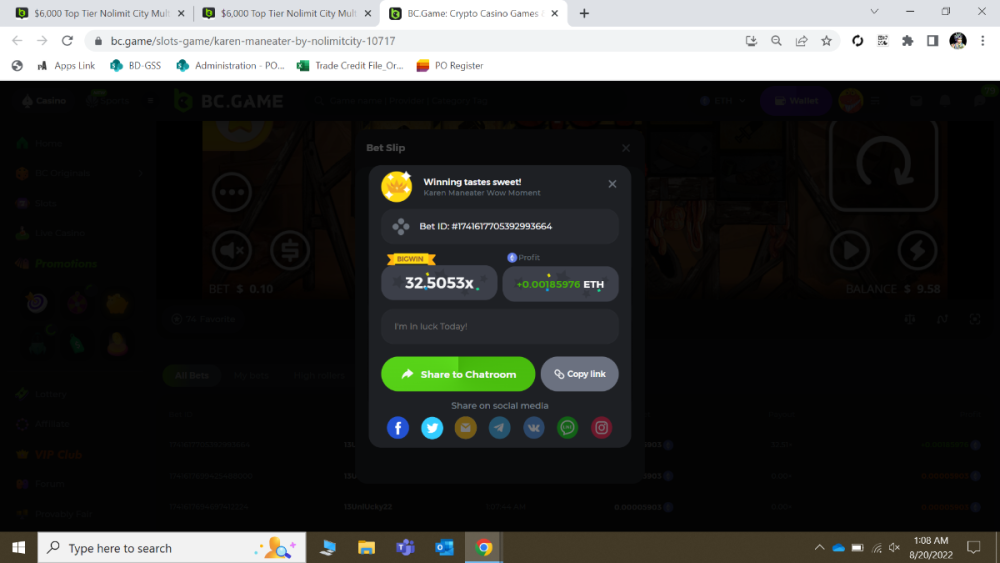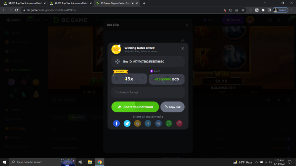 https://bc.game/sd/?sd=10KCTT2DWVITQR The bet amount was .00001 equivalent but because of decreasing coin value it shows .00000964