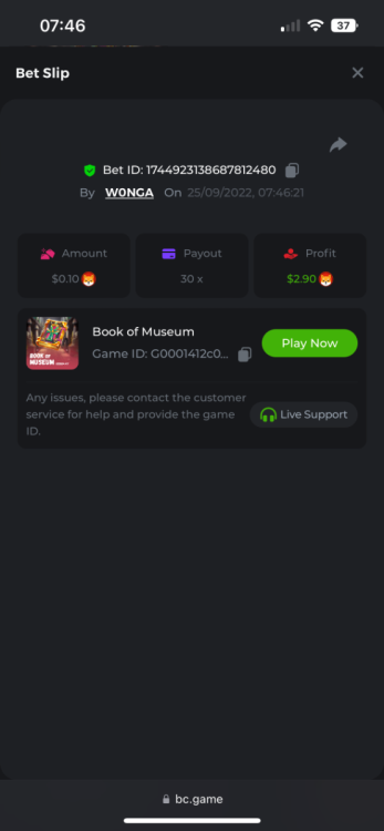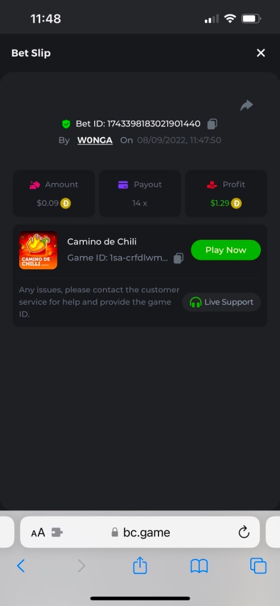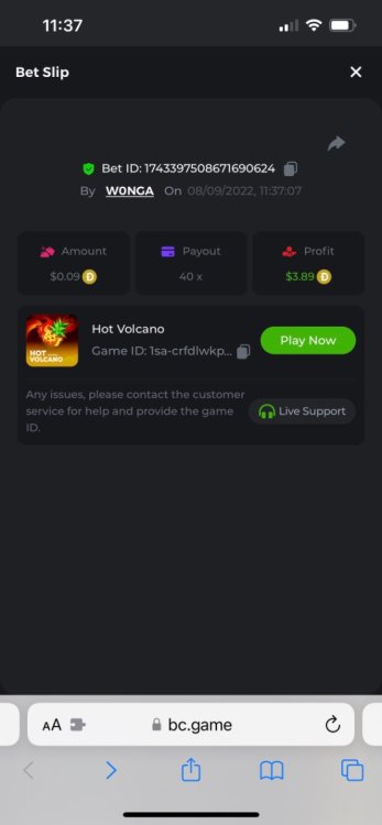 https://bc.game/#/sd/10YFF23M9VN76B This was a clean 50x win on $0.10! But the the dollar conversion says different. https://bcgame-dk2.pragmaticplay.net/gs2c/lastGameHistory.do?symbol=vs10bbbonanza&mgckey=AUTHTOKEN@11cc628b718a1c586678b11736e84ea3dfa730c7917478308de6e25bef028d13~stylename@bcgame_bcgame~SESSION@23942c19-4f81-4335-ac9a-6cefff7f9a75~SN@192ffaf4&tz=-00%3A00&mgckey=AUTHTOKEN@11cc628b718a1c586678b11736e84ea3dfa730c7917478308de6e25bef028d13~stylename@bcgame_bcgame~SESSION@23942c19-4f81-4335-ac9a-6cefff7f9a75~SN@192ffaf4 https://bc.game/#/sd/10YFG753VMQS5V https://bc.game/#/sd/10YFGJAIT2RMS3 https://bc.game/#/sd/10YFGXMC5YV8K3 https://bc.game/#/sd/10YGZ4VK6RWOIB -