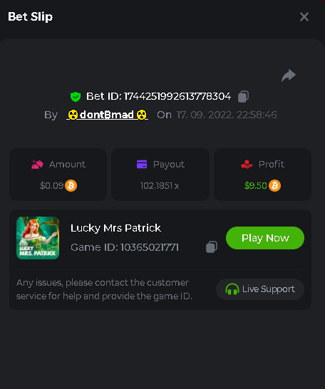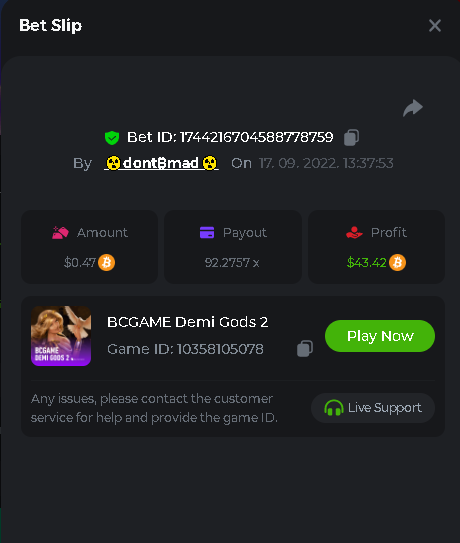Hell Hot 100 - 20x https://bc.game/#/sd/10UXHLAVC9ZX1V 100 Zombies - 85.25x https://bc.game/#/sd/10UXJBRG5L16VN Book of Vlad - 110x https://bc.game/#/sd/10UXRKGB0FKK5V Cyber Wolf - 46.5x https://bc.game/#/sd/10UXTNJE3CZT3N Dia De Los Muertos - 200x https://bc.game/#/sd/10UYYV80TQ44K3 Hell Hot 20 - 34x https://bc.game/#/sd/10UYZVZZG388B7 Magnum Opus - 32x https://bc.game/#/sd/10UZ0DIWSUJGUR Minotaur - 22x https://bc.game/#/sd/10UZ171Y4Z2CCZ The Vampires - 48x https://bc.game/#/sd/10UZ1LOEI4TYXF Voodoo - 180x https://bc.game/#/sd/10UZ2YM0FITKB7 BOUNTY - 50x https://bc.game/#/sd/10UYY167BADL3N