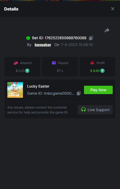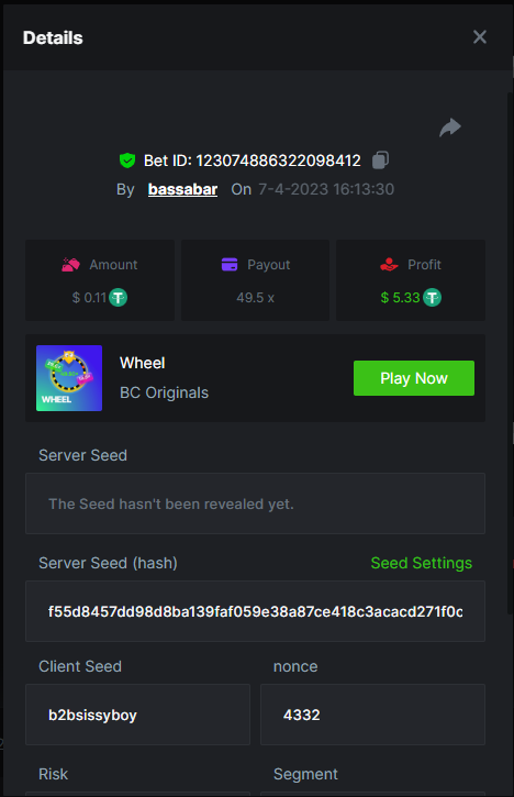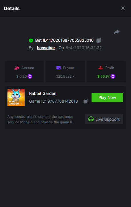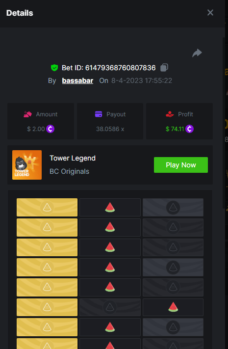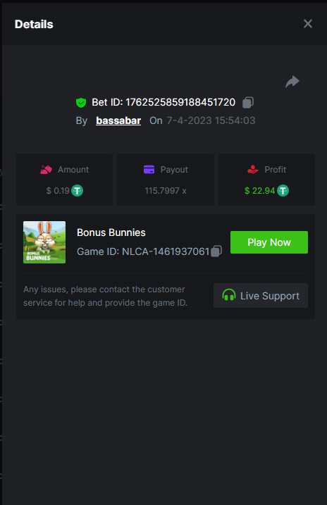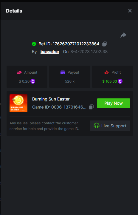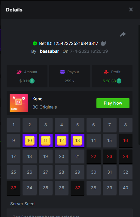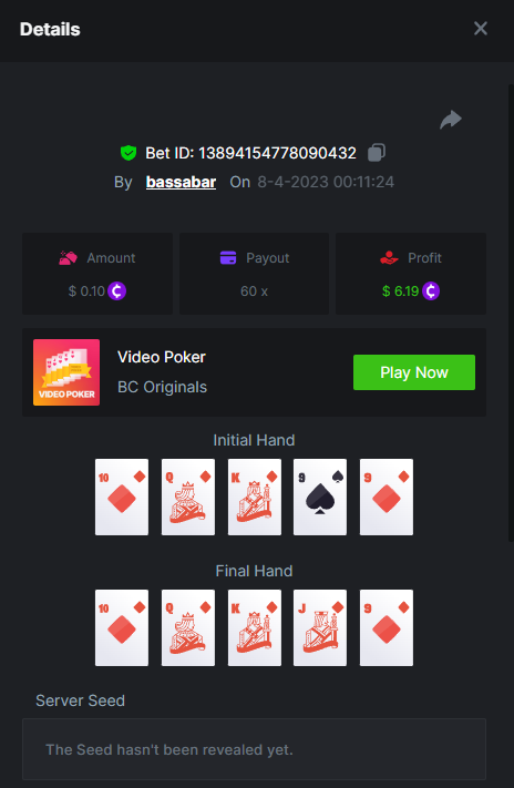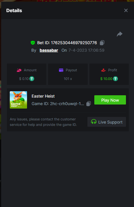 So it's just who place the highest bet on a single 12x win? Not consecutive wins or something? 12x https://bc.game/#/sd/114VKR7ICKMGPF Bounty (Tie, all red) https://bc.game/#/sd/114LUSQGPLD9G3