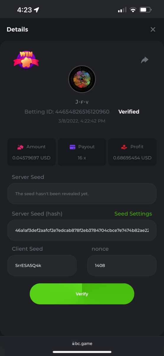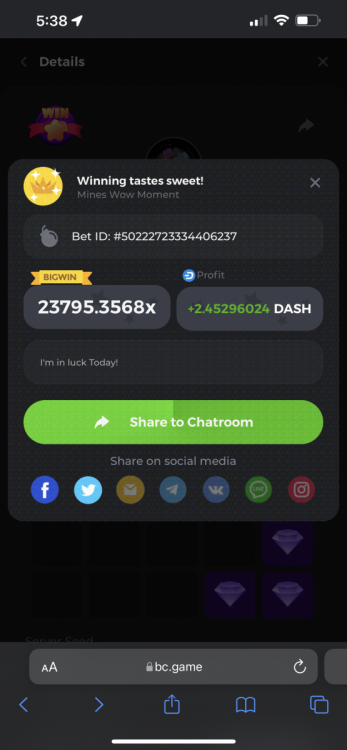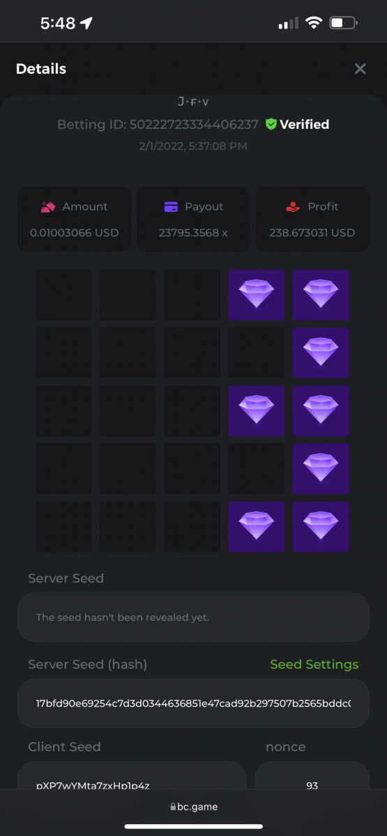 2. Bet ID: 50222723334406237 I’m certain this won’t qualify but posting anyway in the hopes of an honorable mention. Lol. I’ve been hunting this 15 mine/8 diamond combo for months and finally hit it today.