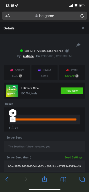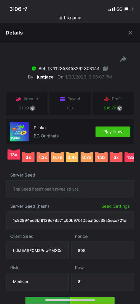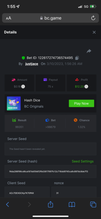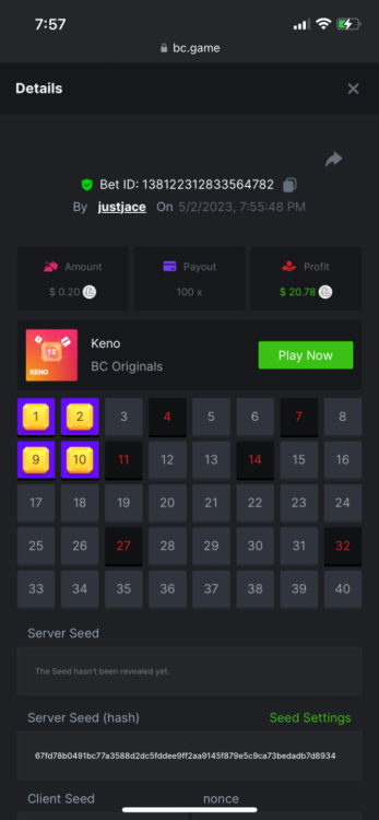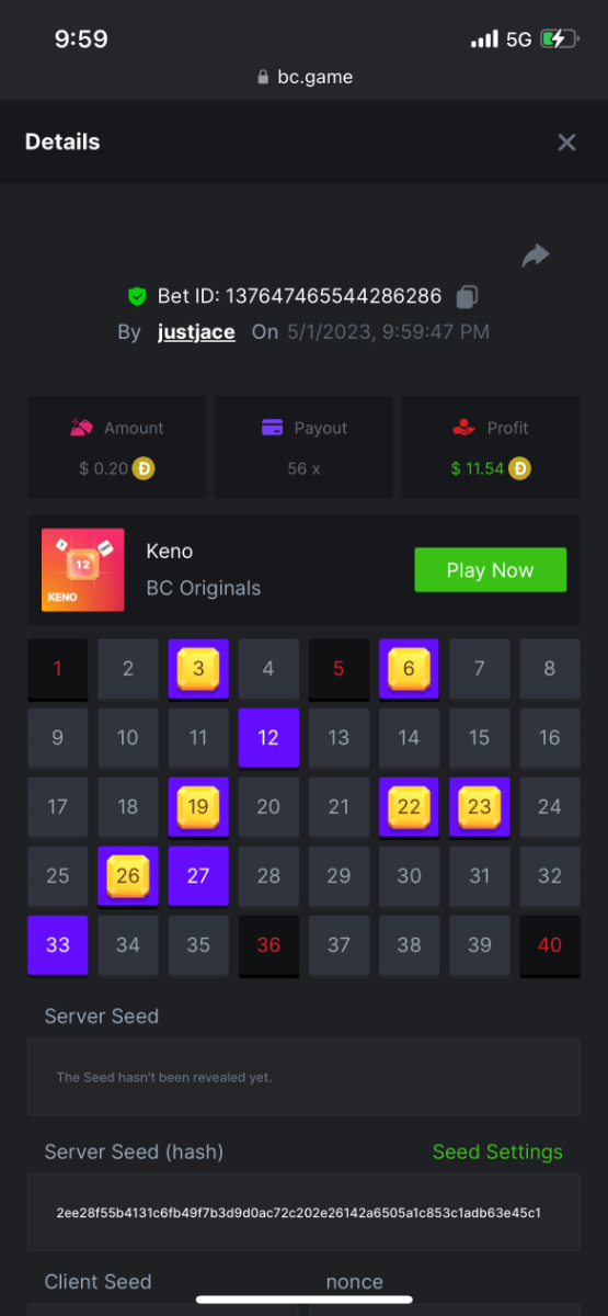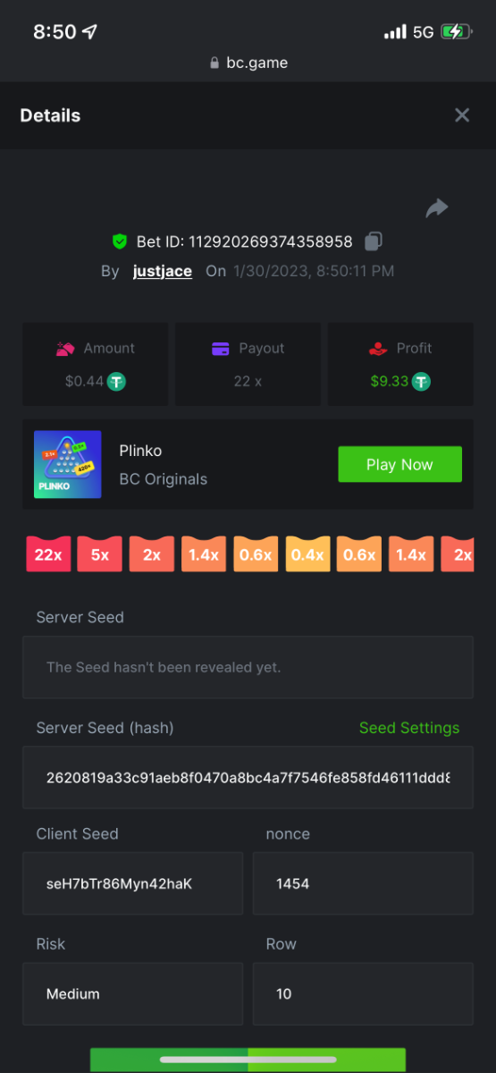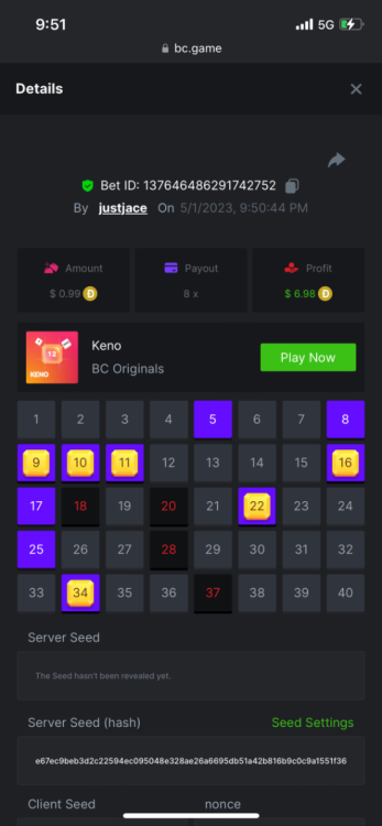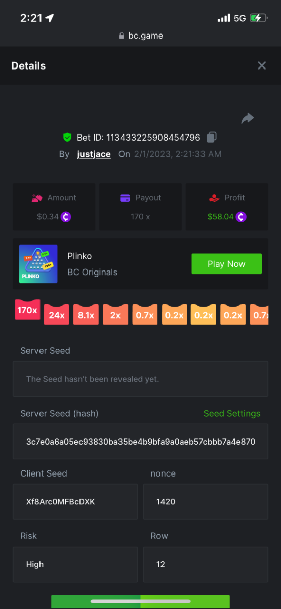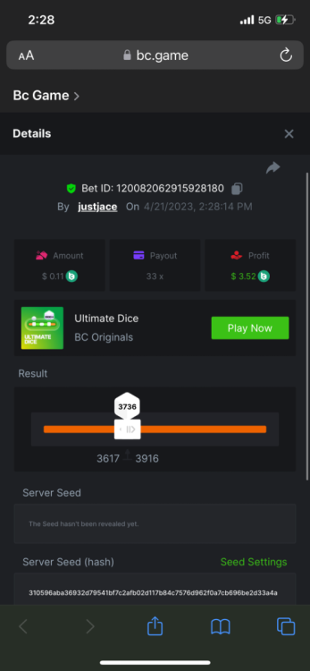 5.1x: https://bc.game/#/sd/118ROTNAR84R9V 8x: https://bc.game/#/sd/118RQVPP8BQYAB 11x: https://bc.game/#/sd/118RPW4RVZQVPV 56x: https://bc.game/#/sd/118RRFI8VER3TF 81.5x: https://bc.game/#/sd/118RS6P6T5KLJN 100x: https://bc.game/#/sd/118U0YISWJW5CJ