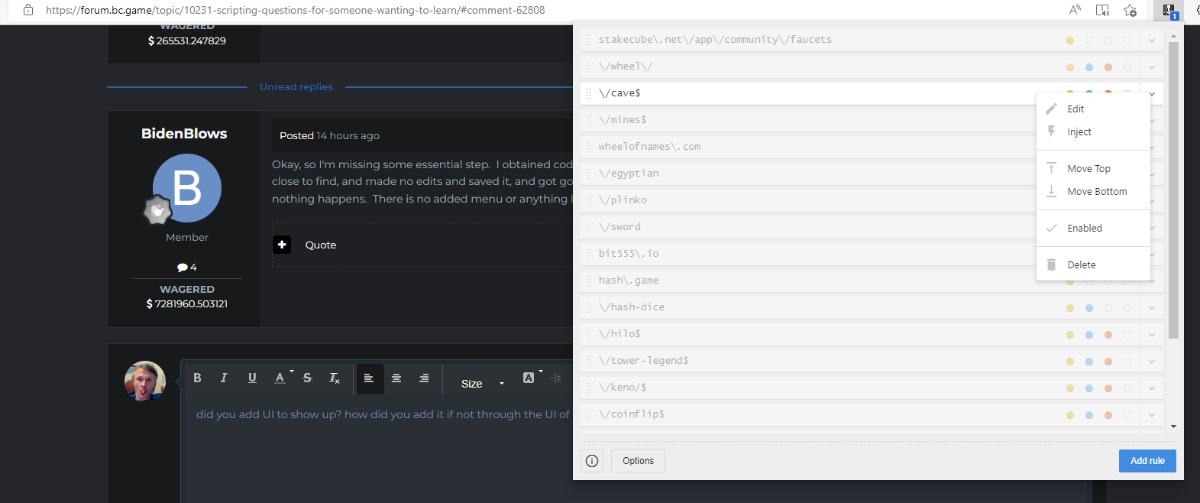 Skele Posted July 20, 2022 Share Posted July 20, 2022 did you add UI to show up? how did you add it if not through the UI of the plugin. oh i know what your problem likely is, the code injector needs an actual page load before it recognizes the change since bc does a lot of ajaxy nice navigation stuff. There is a way to capture that event but its not worth putting in these scripts. It could be useful if you write a browser plugin though. Link to comment Share on other sites More sharing options...