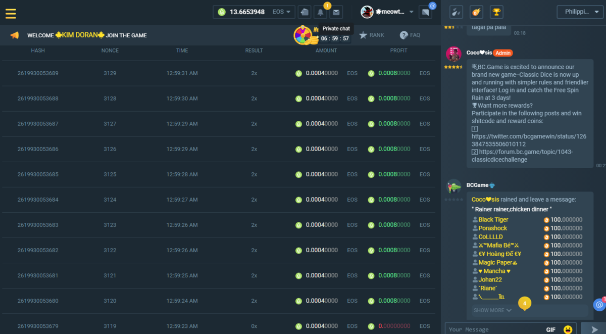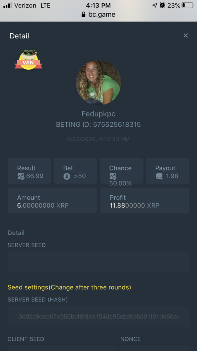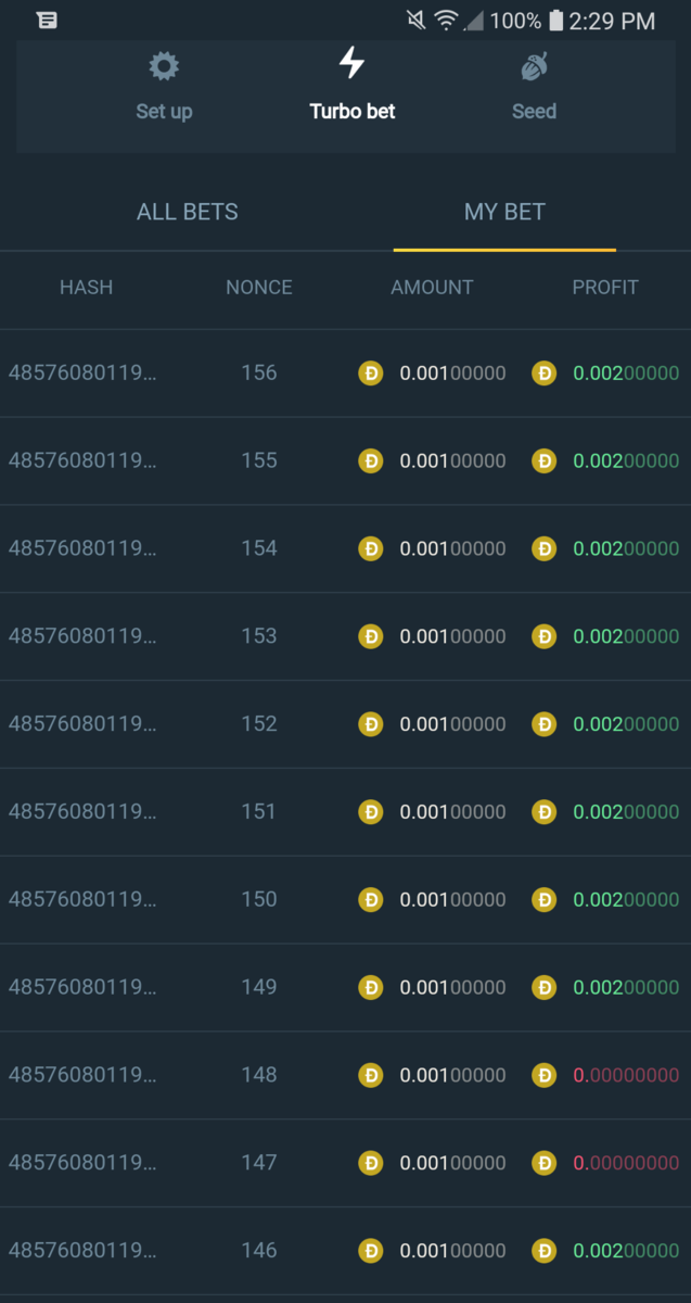 DEPOtrusWDkagak Posted May 22, 2020 Share Posted May 22, 2020 4 hours ago, Cocosis said: BC.Game is excited to announce that a brand new game has just hit our online casino--give a shout out to Classic Dice!!!You can play it with your brain shut down. ______________________________________________________________________________________________________________________________________________ Now we start the Classic Dice challenge! Countdown to end: 3 days, 23 hours, 59 minutes. Time zone: UTC-4___________________________ The first 50 players who response with all-green screenshots below this post will get 1000 DOGE.What is all-green? It means you’ll need to get at least a streak of 8 wins (payout 2x). Requirements:. Betting in JB&TRTL doesn’t count.. 8 corresponding HASH should also be sent along.(https://bcsnproject.github.io/bcgame-roll/?serverSeed= [your game hash]). Minimum payout is 2x. ️Posts that doesn’t follow the requirements will be deleted. Link to comment Share on other sites More sharing options...
