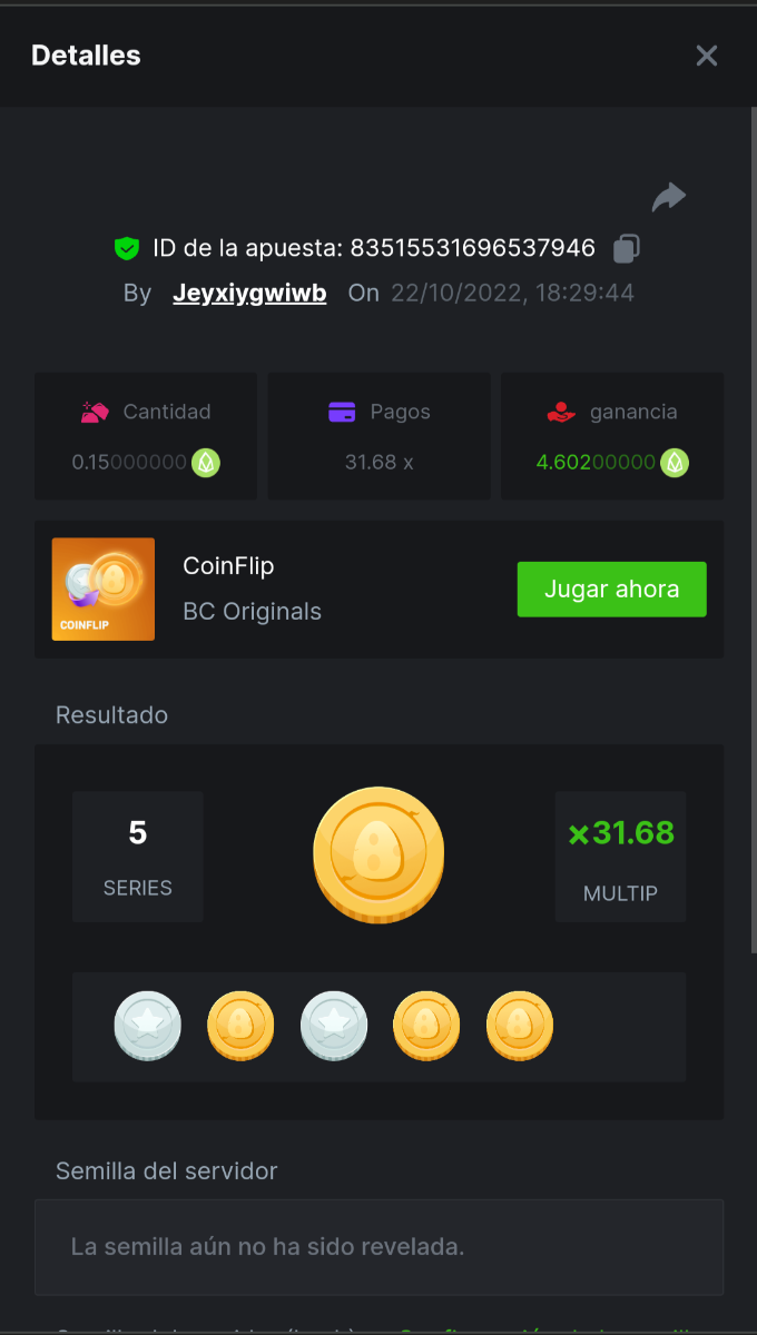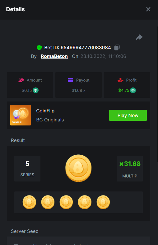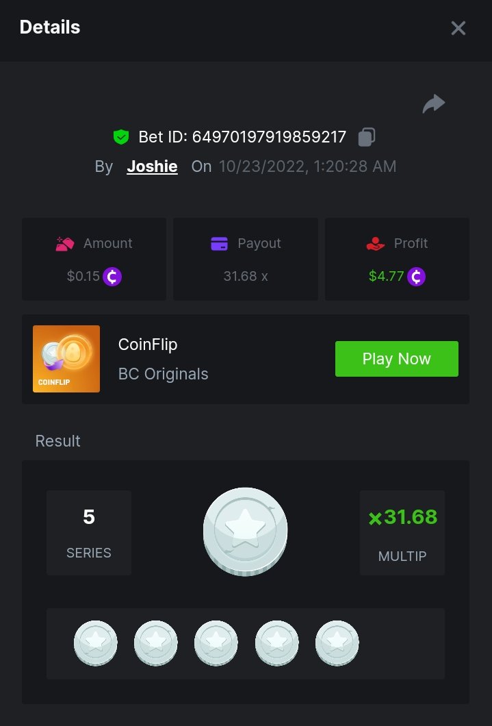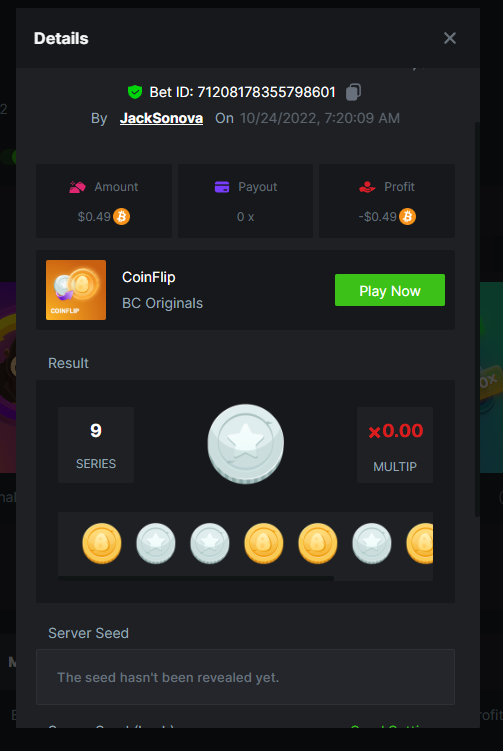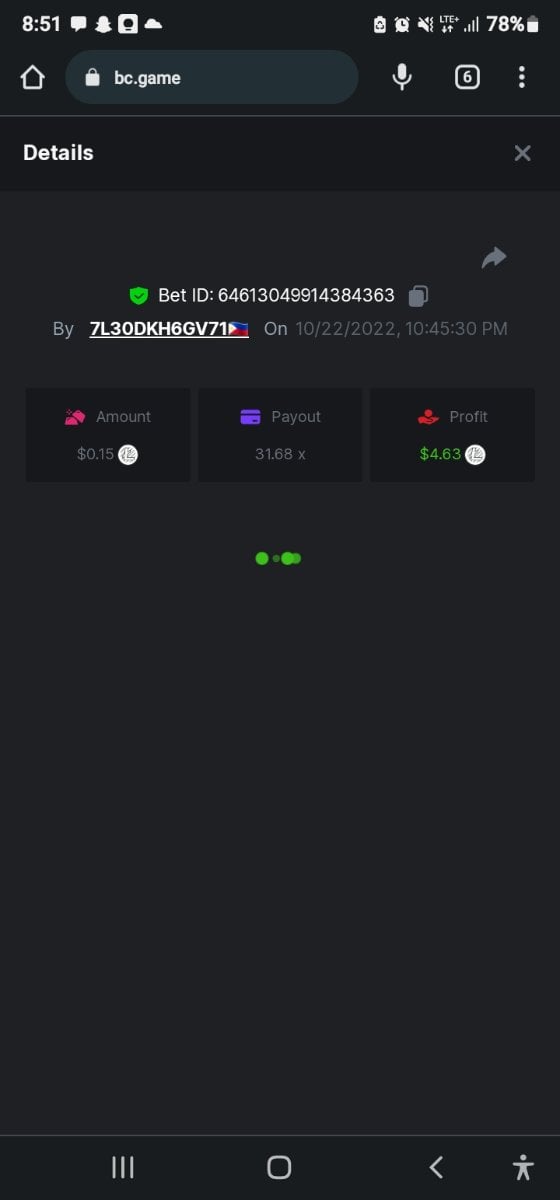 JackSonova Posted October 22, 2022 Share Posted October 22, 2022 (edited) Bounty qualified first post/edit: Bet ID: 71208178355798142 https://bc.game/#/sd/10VLM0T0UNY2AB I noticed for the bounty entry (1st one) the amount says $0.14 even though I bet $0.15 USD equivalent as required, but just to be sure so that it qualifies for bounty and meets requirements, here's a screenshot of the game just ending showing it was $0.15 for the bet amount Bet ID 71208178355798421 https://bc.game/#/sd/10VQ7FGVYWP24Z Bet ID: 71208178355798601 https://bc.game/#/sd/10VQ8G1CQMPUS3 Edited October 24, 2022 by JackSonova added new play 1 Link to comment Share on other sites More sharing options...