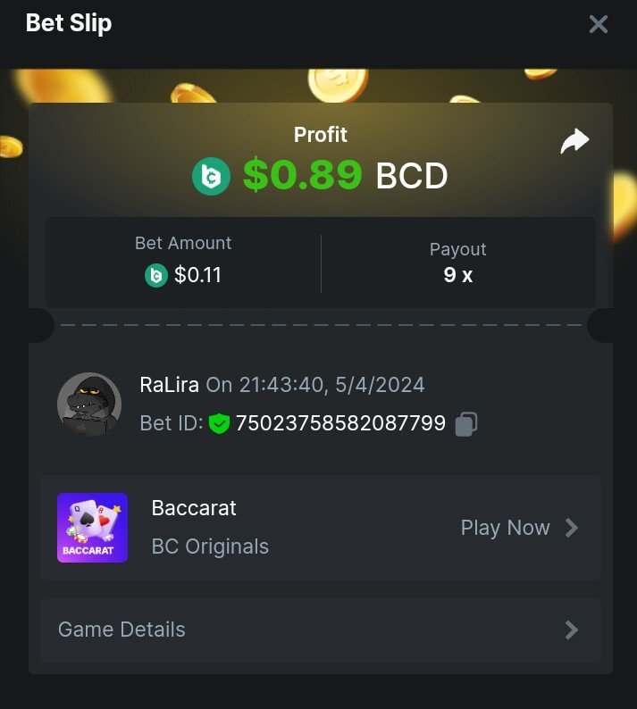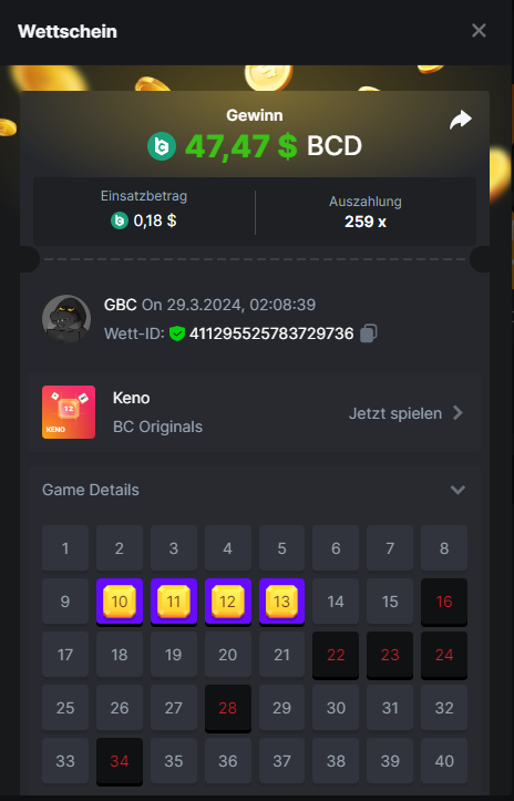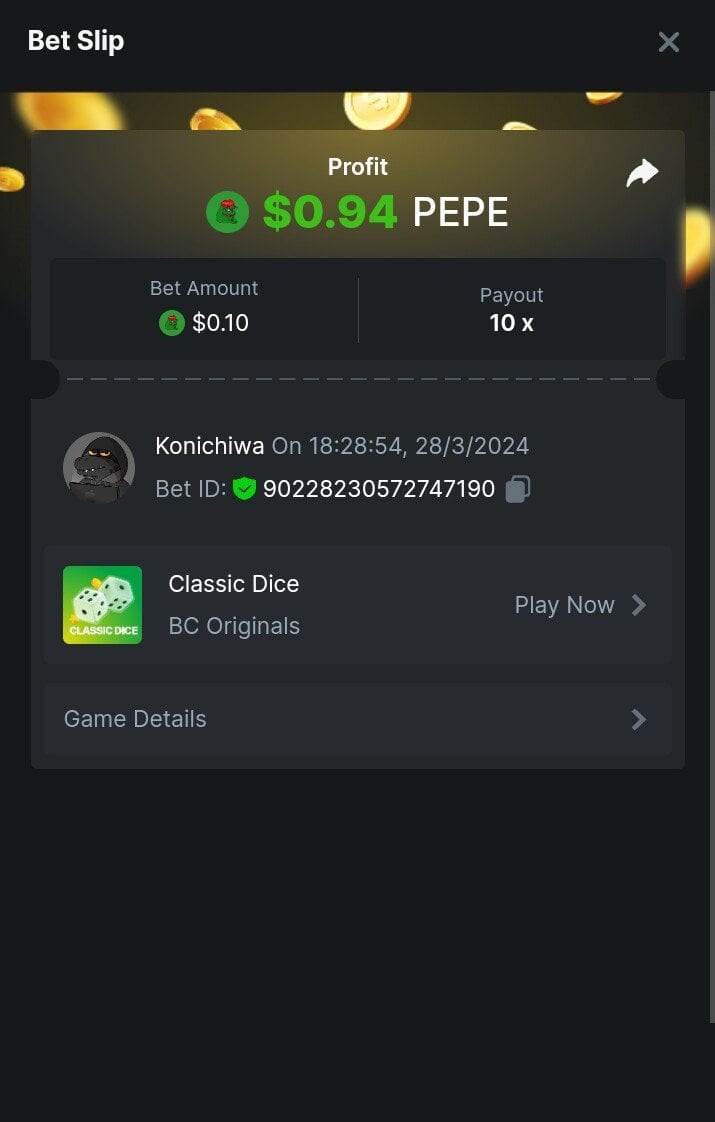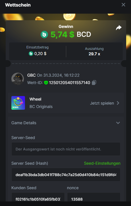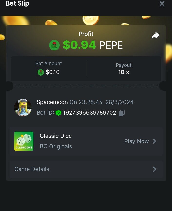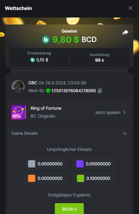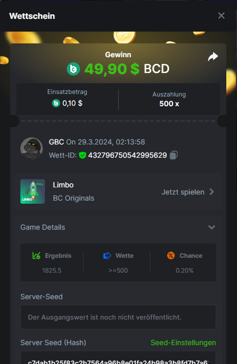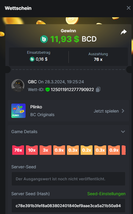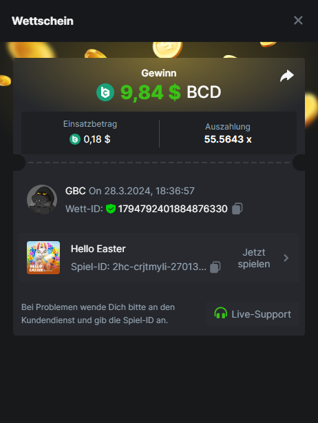 GBC Posted March 28, 2024 Share Posted March 28, 2024 (edited) Classic Dice x10 https://bc.game/#/sd/11VLHRJG9EDT1F Run away Zombies 10x https://bc.game/#/sd/11VLIIWJAYVR4R Baccarat 9x https://bc.game/#/sd/11VLJ1UIYLB03N John Wild 20x https://bc.game/#/sd/11VLJCRRPWKMO7 Twist 15.5x https://bc.game/#/sd/11VLJVMYZJP89N Hello Easter 20X https://bc.game/#/sd/11VLKHQJX5UFX7 Lucky Easter 30X Red Tiger https://bc.game/#/sd/11VLKVPZ7TD0S7 Plinko 76x https://bc.game/#/sd/11VLNHKXB2B94Z Keno 50X https://bc.game/#/sd/11VLZXXWSETGEB Ring of Fortune 99X https://bc.game/#/sd/11VM109IJOCIBR Keno 259x https://bc.game/#/sd/11VMCHB3928KRF Limbo 500x https://bc.game/#/sd/11VMCSY8LKEMYV Roulette Singe 36x https://bc.game/#/sd/11VSMS95Z2L4P7 Wheel 29.7x https://bc.game/#/sd/11VSNGSS4B8GRR Bonus Bunnies 100x https://bc.game/#/sd/11VSP85GLT76DN Easter Heist 90x https://bc.game/#/sd/11VSSCFCBR49R3 Crash 10x https://bc.game/#/sd/11W08C2OE5G03B Black Jack Player 3!!! Statistik do not work correkt https://bc.game/#/sd/11W0B3OVLQ3INF Edited April 3, 2024 by GBC Link to comment Share on other sites More sharing options...