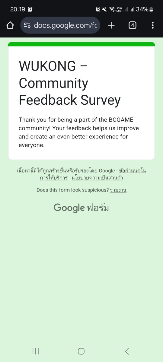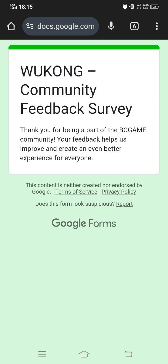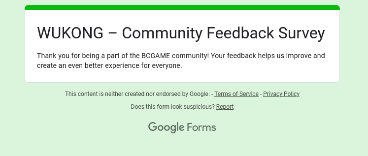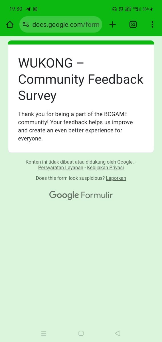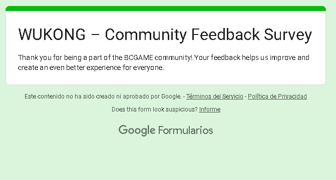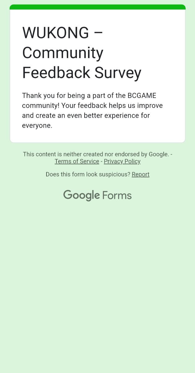 Event Team BCGame_Maxim Posted February 20 Event Team Share Posted February 20 WUKONG Community Survey Giveaway!Share Your Feedback & Win! End date: 1st March, 2025 Hey BC.GAME Fam! WUKONG has been out for a few months now, and we want YOUR thoughts! Whether itβs the gameplay, mechanics, or overall experience, your feedback helps us improve it! How to Participate: Complete the WUKONG Feedback Survey Reply to this post with your WUKONG experience! Get a chance to win exclusive surprise rewards! 20 lucky winners will score mystery prizes! Donβt miss out! Fill out the feedback form now: https://forms.gle/iu5yLBY19a48timE8 Winners will be announced on the forum after the giveaway ends. Stay tuned & good luck! 6 Link to comment Share on other sites More sharing options...
