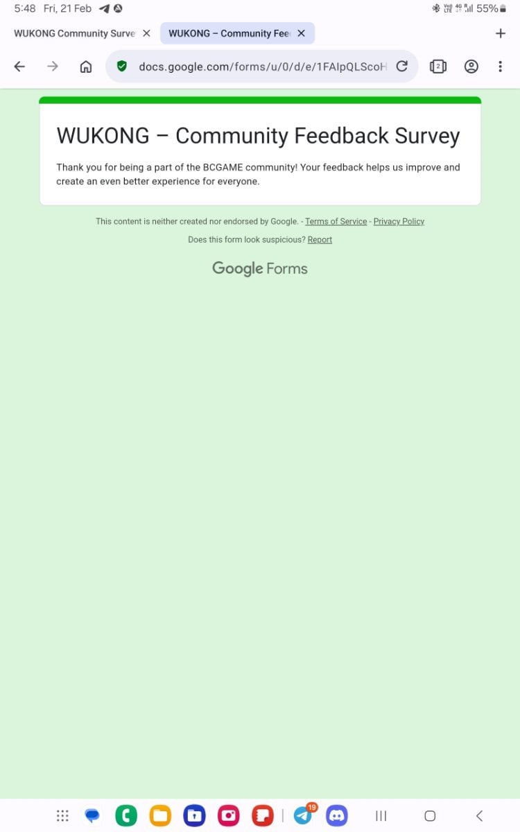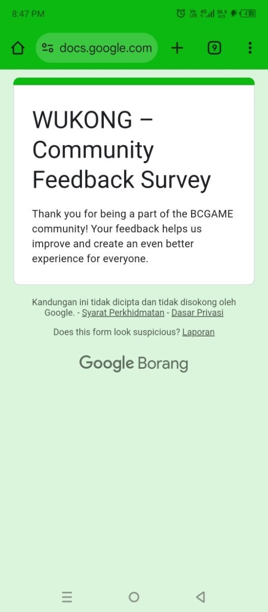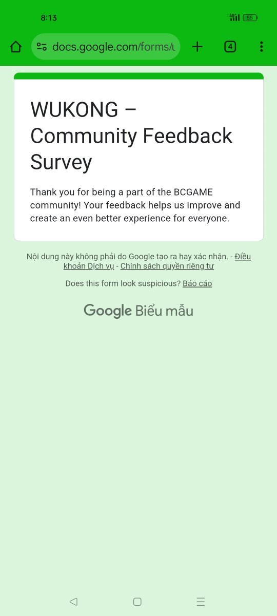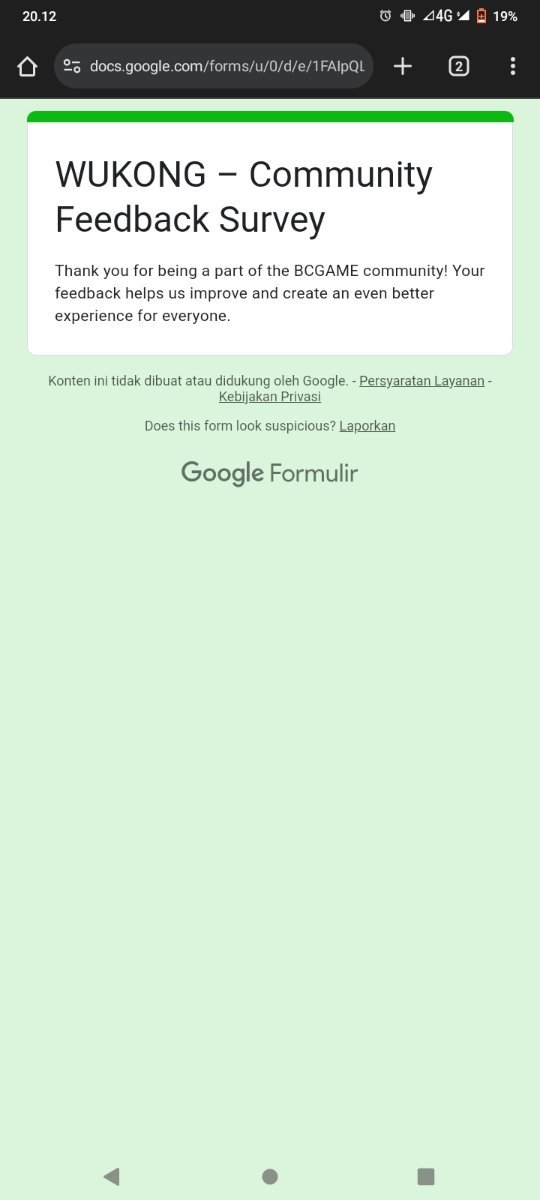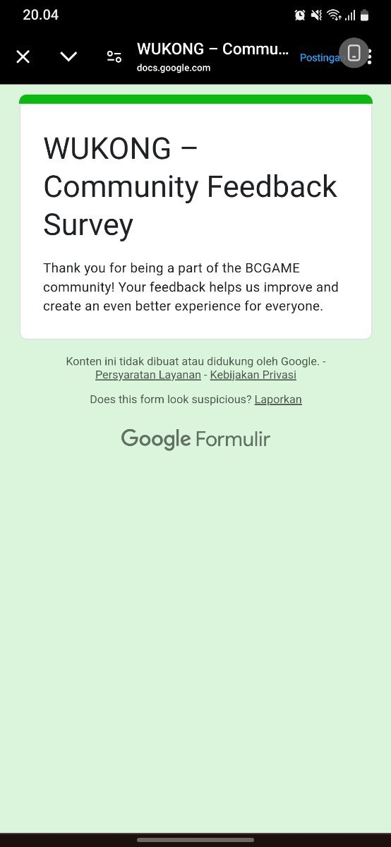 Event Team BCGame_Maxim Posted February 20 Event Team Share Posted February 20 WUKONG Community Survey Giveaway!Share Your Feedback & Win! End date: 1st March, 2025 Hey BC.GAME Fam! WUKONG has been out for a few months now, and we want YOUR thoughts! Whether itβs the gameplay, mechanics, or overall experience, your feedback helps us improve it! How to Participate: Complete the WUKONG Feedback Survey Reply to this post with your WUKONG experience! Get a chance to win exclusive surprise rewards! 20 lucky winners will score mystery prizes! Donβt miss out! Fill out the feedback form now: https://forms.gle/iu5yLBY19a48timE8 Winners will be announced on the forum after the giveaway ends. Stay tuned & good luck! 6 Link to comment Share on other sites More sharing options...