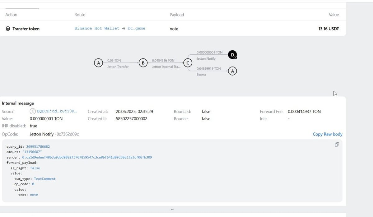 I made a USDT deposit of 13.16 USDT via the TON network on June 20, 2025 at 02:35 UTC to BC.Game from Binance.