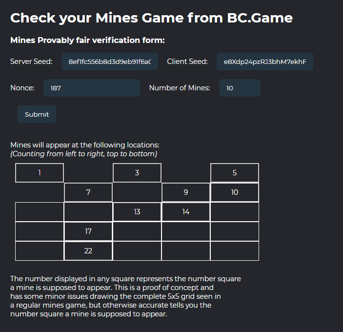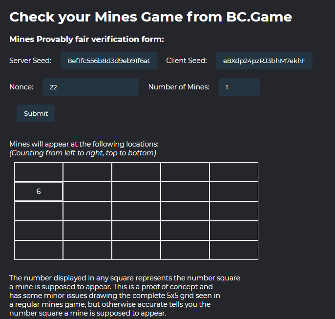 JackSonova Posted December 31, 2022 Share Posted December 31, 2022 On 1/13/2022 at 3:05 AM, BCGame_Bob said: Where is our smart coders now ? lets see some submissions I may not be a smart coder, but I learned some coding just for this! Please see my submission for my Mines Provably Fair Checker: https://codepen.io/nucleare/pen/ZEjWVmr The most challenging part as a non-coder to learn and realize was that the original JavaScript given by the provably fair page for mines is meant to function in a Node.js environment and to be used with a browser, I had to adapt the script to use crypto.js There's still some visual improvements to be applied but I believe the harder part of the coding has been done and has been made to account for setting the number of mines as shown: Changing the number of mines and submitting the form again will update the table as appropriate, displaying the number result in the appropriate equivalent location: The final steps will be replacing empty squares with gems, and the numbers with graphics of the mines and of course, as a result of that, fix the appearance of the grid not breaking up like it does, depending on the number of mines being selected. But, for the record, on certain 'Number of Mines' settings, it will display correctly: After submitting these screenshots, I fixed some of the grammatical errors and improved the wording to be more clear: Thank you for your consideration! 1 Link to comment Share on other sites More sharing options...